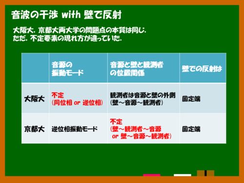 大阪大,京都大と関西国公立の2大巨頭で,「音波の干渉 with 壁で反射」で指摘を受けるということになりました.ちょっとポイントをわたしなりに整理してみました.必要な考え方や情報は以下を参照いただければよいかと. 縦波の反射~2017年大阪大物理[3]の…